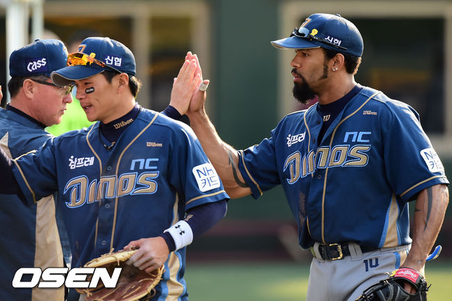 경기를 마치고 NC 테임즈가 김경문 감독과 하이파이브를 하고 있다. / rumi@osen.co.kr