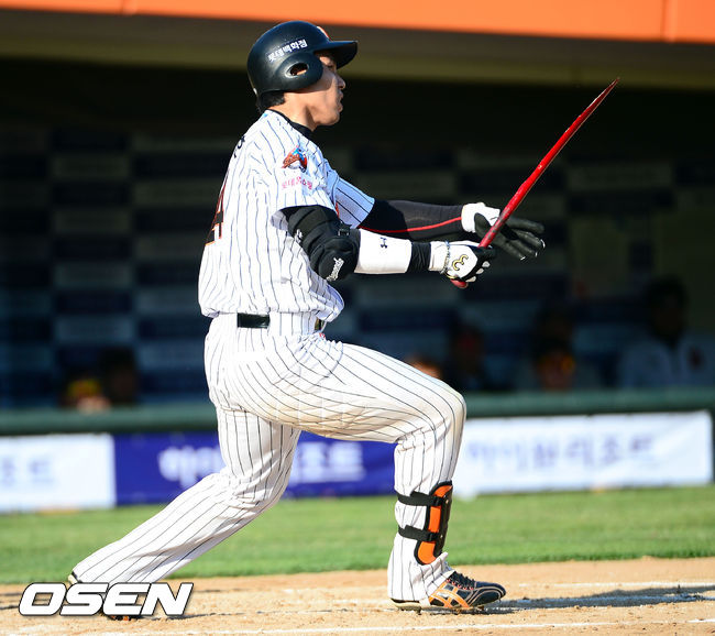 6일 오후 부산 사직구장에서 열린 '2014 한국야쿠르트 세븐 프로야구' 롯데 자이언츠와 두산 베어스의 경기, 7회말 1사 주자없는상황에서 김문호가 우중간 안타를 날리고 있다.