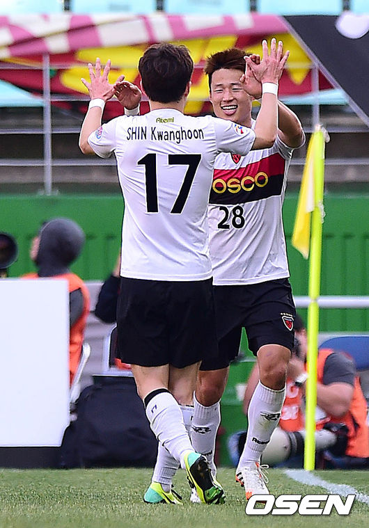 후반 포항 손준호가 동점골을 작렬 시킨 뒤 신광훈과 인사를 나누고 있다.
