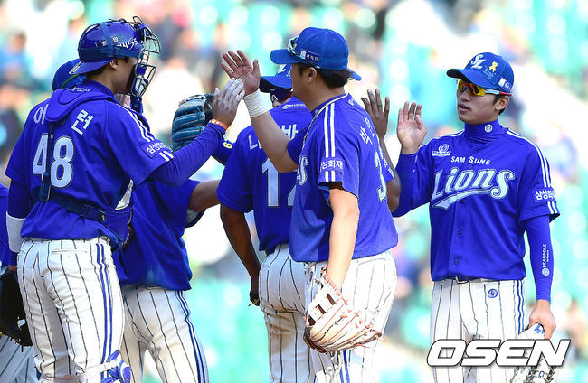 승리를 거둔 삼성 선수들이 하이파이브를 하고 있다./youngrae@osen.co.kr