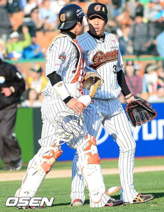 경기종료 후, 승리한 롯데 용덕한과 김승회가 인사를 나누고 있다. /ouxou@osen.co.kr
