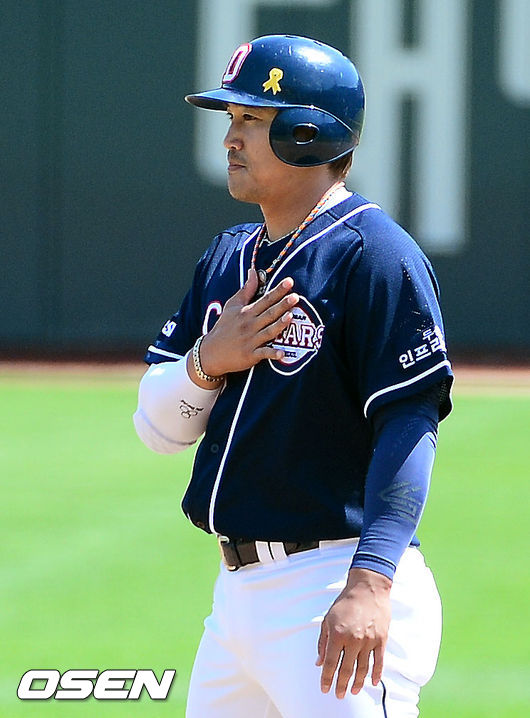 6일 오후 부산 사직구장에서 열린 '2014 한국야쿠르트 세븐 프로야구' 롯데 자이언츠와 두산 베어스의 경기, 1회초 2사 1,3루 1000타점을 올리는 안타를 날린 1루에서 홍성흔이 가슴에 손을 얹고 기뻐하고 있다.