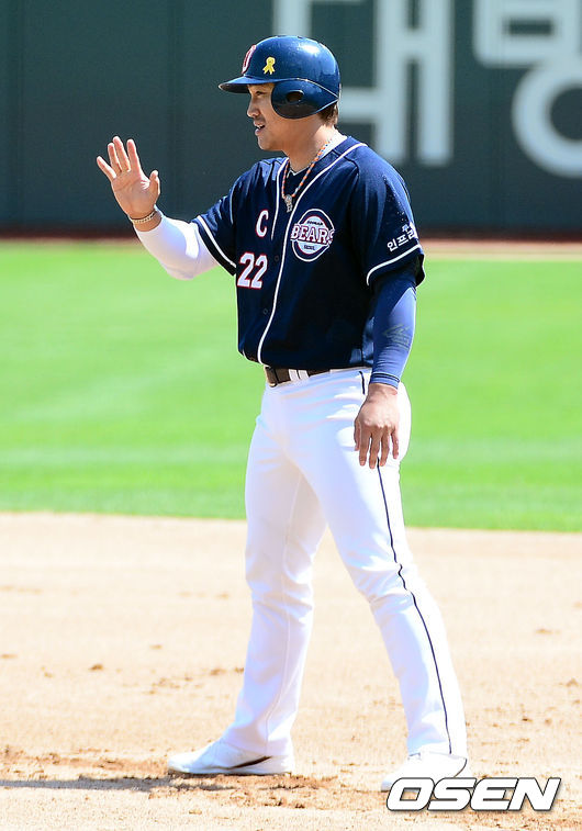 6일 오후 부산 사직구장에서 열린 '2014 한국야쿠르트 세븐 프로야구' 롯데 자이언츠와 두산 베어스의 경기, 1회초 2사 1,3루 1000타점을 올리는 안타를 날린 홍성흔이 옅은 미소를 짓고 있다.