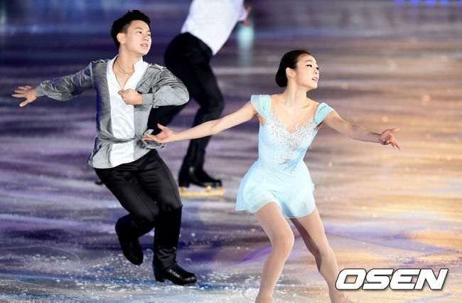 김연아가 데니스 텐과 오프닝 무대를 선보이고 있다.