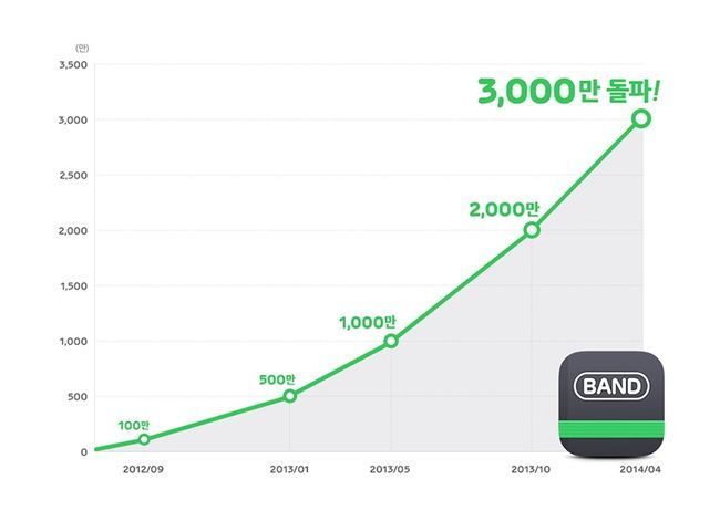 밴드는 2012년 8월 서비스 출시 이후, 9개월만인 지난 5월 1000만 다운로드를 넘어 선 이래, 성장세가 더욱 가속화되며 2013년 10월 2000만 다운로드, 2014년 4월 말 기준으로 3000만 다운로드를 돌파했다.