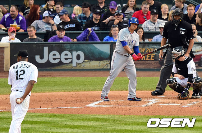 7일(이하 한국시각) 미국 콜로라도주 덴버 쿠어스 필드에서 열린 '2014 메이저리그' 콜로라도 로키스와 텍사스 레인저스의 경기 3회초 1사 1루 추신수가 타석에 들어서고 있다.