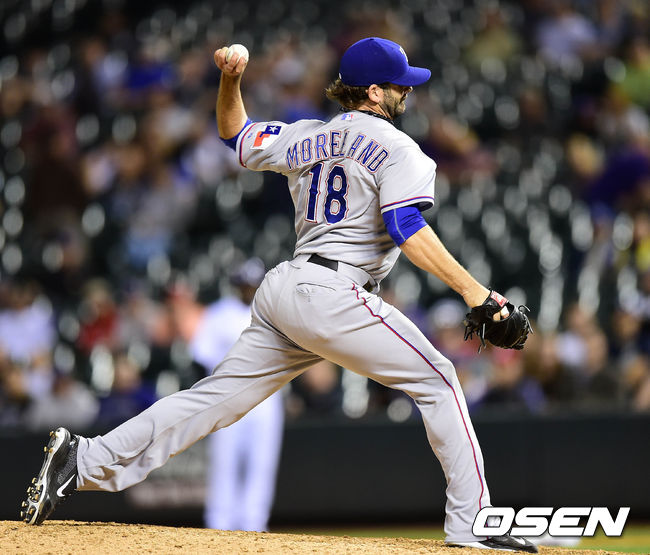 7일(이하 한국시각) 미국 콜로라도주 덴버 쿠어스 필드에서 열린 '2014 메이저리그' 콜로라도 로키스와 텍사스 레인저스의 경기 8회말 마운드에 올라온 미치 모어랜드가 피칭을 하고 있다.
