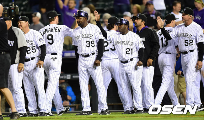 7일(이하 한국시각) 미국 콜로라도주 덴버 쿠어스 필드에서 열린 '2014 메이저리그' 콜로라도 로키스와 텍사스 레인저스의 경기 종료 후 콜로라도 선수들과 코칭 스텝들이 하이파이브를 하고 있다.