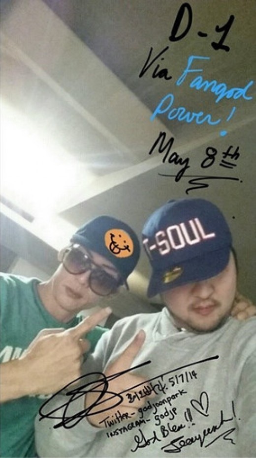 특히 두 사람은 숫자 1을 의미하는 손동작을 나란히 해 보여 눈길을 끈다. 이는 god 컴백이 단 하루 남았음을 의미하는 동작이다.