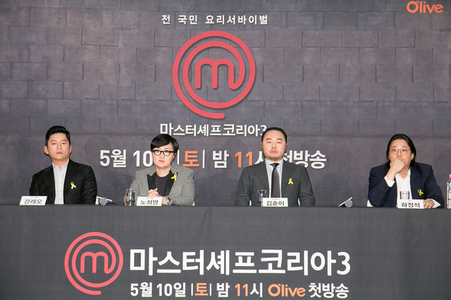 7일 오후 2시 서울 광화문 프레스센터 20층 내셔널 프레스클럽에서 열린 올리브TV '마스터 셰프 코리아3'(이하 '마셰코3') 제작 발표회에는 강레오, 노희영, 김훈이 심사위원과 시즌1부터 프로그램을 진두지휘한 하정석 CP가 참석했다.