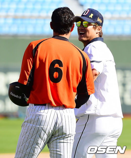 7일 오후 부산 사직구장에서 열린 '2014 한국야쿠르트 세븐 프로야구' 롯데 자이언츠와 두산 베어스의 경기에 앞서 두산 홍성흔이 롯데 황재균을 향해 미소짓고 있다.