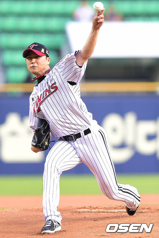 LG 선발 신재웅이 힘차게 공을 뿌리고 있다.