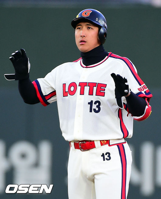 7일 오후 부산 사직구장에서 열린 '2014 한국야쿠르트 세븐 프로야구' 롯데 자이언츠와 두산 베어스의 경기, 1회말 2사 1,2루 좌월 1타점 2루타를 날린 황재균이 2루에서 기뻐하고 있다.