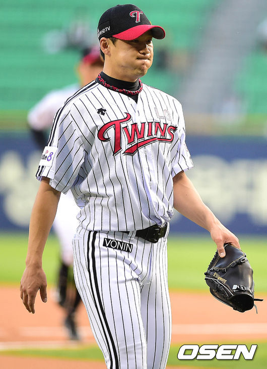 1회초 한화 공격 때 2실점 한 LG 선발 신재웅이 이닝을 마치고 더그아웃으로 들어오고 있다.
