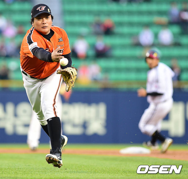 1회말 LG 공격 2사 1, 2루 상황 박용근의 내야 땅볼 타구를 잡은 한화 1루수 김태균이 1루로 토스 송구를 하고 있다.