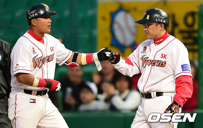 3회말 무사 SK 허웅이 선두타자로 나서 안타를 때린 뒤 1루 백재호 코치와 하이파이브를 하고 있다.