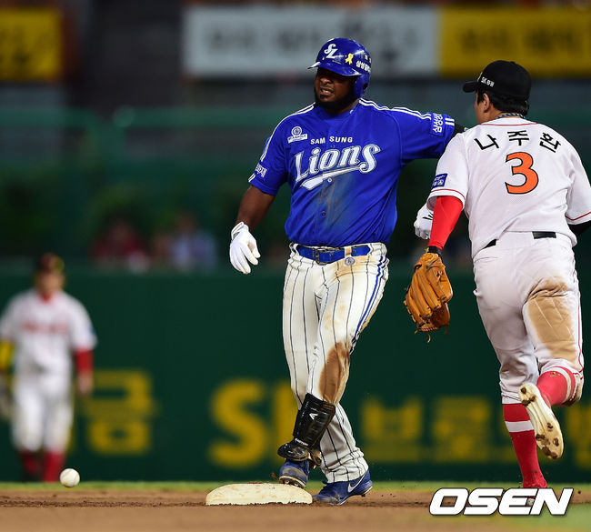 4회초 무사 선두타자로 나선 삼성 나바로가 안타를 때린 뒤 2루까지 진루하다 SK 1루 박정권이 던진 공에 맞아 고통스러워 하고 있다.