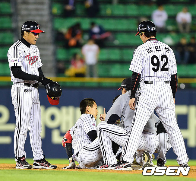 4회말 LG 공격 1사 만루 상황 백창수가 2타점 중전 안타를 날리고 상대 실책을 틈타 2루까지 내달렸다. 3루수의 송구에 머리를 맞은 백창수를 체크하는 LG 코칭스태프와 의료진.