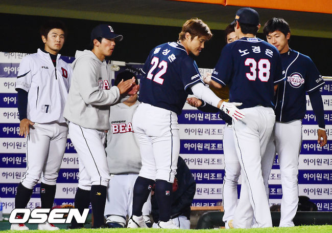 7일 오후 부산 사직구장에서 열린 '2014 한국야쿠르트 세븐 프로야구' 롯데 자이언츠와 두산 베어스의 경기, 4회말 2사 만루 롯데 히메네스에게 2타점 적시타를 허용한 상황. 마운드를 내려온 노경은에게 덕아웃에서 두산 선수들이 격려인사를 건네고 있다.