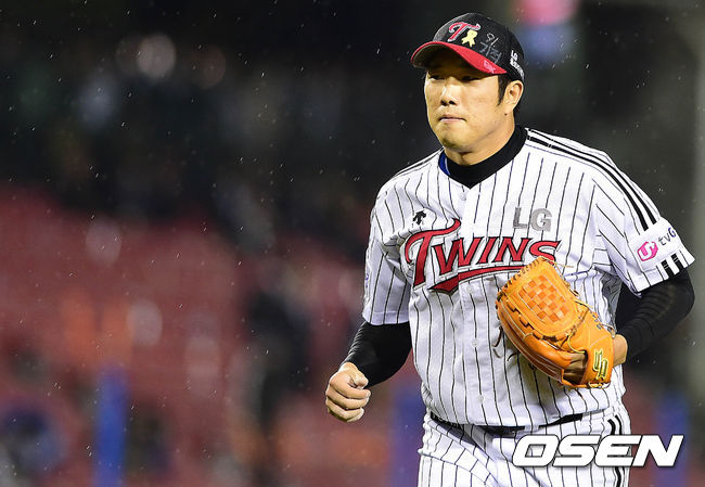 6회초 한화 공격 2사 1, 3루 상황 이용규를 헛스윙 삼진으로 이끌며 이닝을 마친 LG 투수 유원상이 더그아웃으로 들어오고 있다.