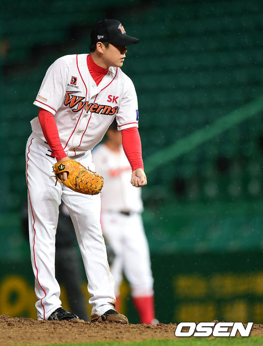 9회초 1사 만루 SK 박희수가 마운드 정비를 요구하고 있다.