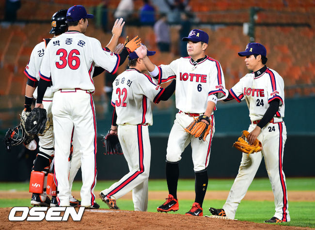 경기종료 후, 승리한 롯데 선수들이 기쁨의 인사를 나누고 있다. /ouxou@osen.co.kr