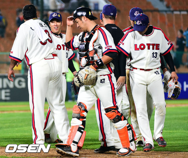 경기종료 후, 승리한 롯데 선수들이 기쁨의 인사를 나누고 있다. /ouxou@osen.co.kr