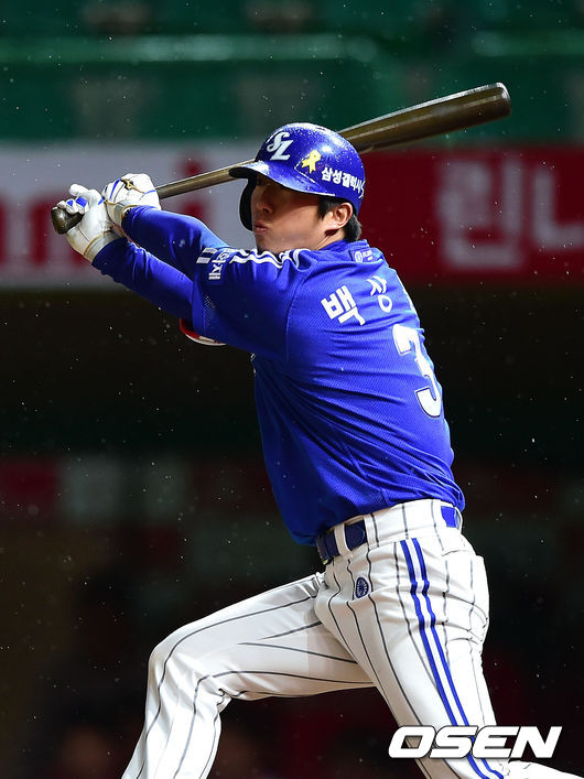 9회초 1사 만루 삼성 백상원이 좌익수 희생플라이를 때리고 있다.