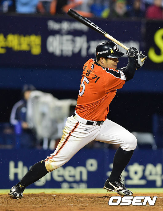 연장 10회초 한화 공격 2사 1, 2루 상황 이양기가 역전 1타점 중전 적시타를 날리고 있다.