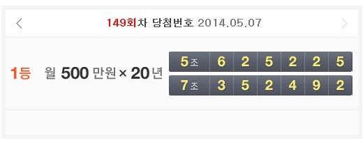 7일 발표된 연금복권 149회 1등 당첨번호는 5조 625225, 7조 352492로 당첨자들에게는 20년간 매달 500만원이 연금 형식으로 지급된다. 22%의 세금을 제외한 실제 수령액은 390만원 정도.