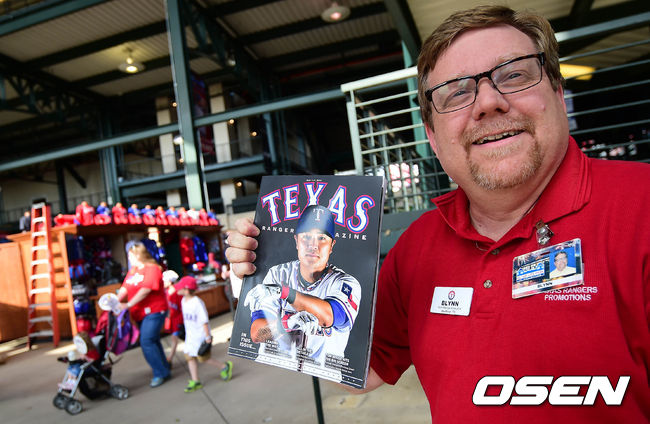 8일(이하 한국시각) 미국 텍사스주 알링턴 글로브 라이프 파크에서 '2014 메이저리그' 텍사스 레인저스와 콜로라도 로키스의 경기가 열리는 가운데, 한 직원이 추신수가 표지로 나온 구단 잡지를 들고 포즈를 취하고 있다.