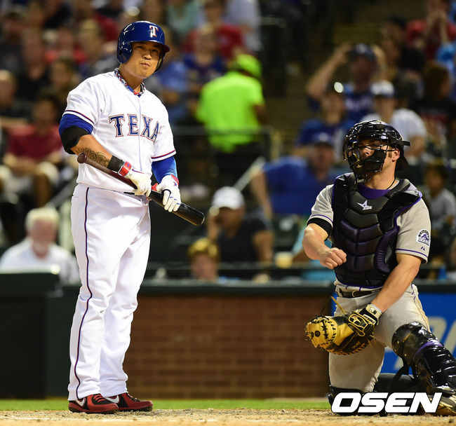 8일(이하 한국시각) 미국 텍사스주 알링턴 글로브 라이프 파크에서 열린 '2014 메이저리그' 텍사스 레인저스와 콜로라도 로키스의 경기 4회말 선두타자 추신수가 삼진을 당하고 아쉬워 하고 있다.