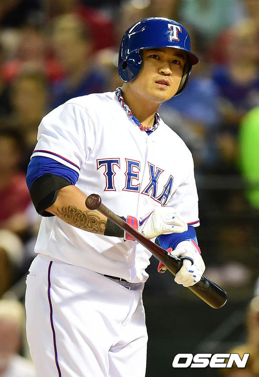 8일(이하 한국시각) 미국 텍사스주 알링턴 글로브 라이프 파크에서 열린 '2014 메이저리그' 텍사스 레인저스와 콜로라도 로키스의 경기 4회말 선두타자 추신수가 삼진을 당하고 아쉬워 하고 있다.