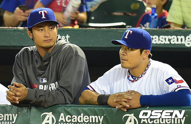 8일(이하 한국시각) 미국 텍사스주 알링턴 글로브 라이프 파크에서 열린 '2014 메이저리그' 텍사스 레인저스와 콜로라도 로키스의 경기 4회말 다르빗슈와 추신수가 경기를 지켜보고 있다.