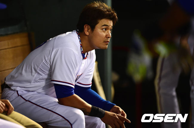 8일(이하 한국시각) 미국 텍사스주 알링턴 글로브 라이프 파크에서 열린 '2014 메이저리그' 텍사스 레인저스와 콜로라도 로키스의 경기 8회말 선두타자 추신수가 삼진을 당하고 돌아와 덕아웃에 앉아 있다.