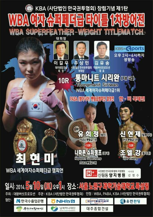 오는 10일 오후 1시, 서울 노원구 과학기술대학교 특설링에서 열리는 'WBA 여자 슈퍼페더급 타이틀 1차 방어전'은 챔피언 최현미와 도전자 롱마니트 시리완(태국)의 타이틀 매치를 메인 이벤트로 정했다. 또 PBBA (범아시아) 팬텀급 챔피언 결정전(유희정 VS 나파폰 슈퍼챔프)과 한비 국제전(신현제 VS 조엘 강)이 함께 열릴 예정이다.