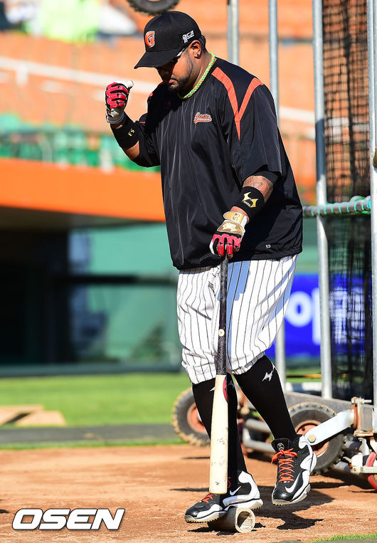 8일 오후 부산 사직구장에서 열린 '2014 한국야쿠르트 세븐 프로야구' 롯데 자이언츠와 두산 베어스의 경기에 앞서 롯데 히메네스가 타격 훈련 도중 벨런스 훈련을 하고 있다.