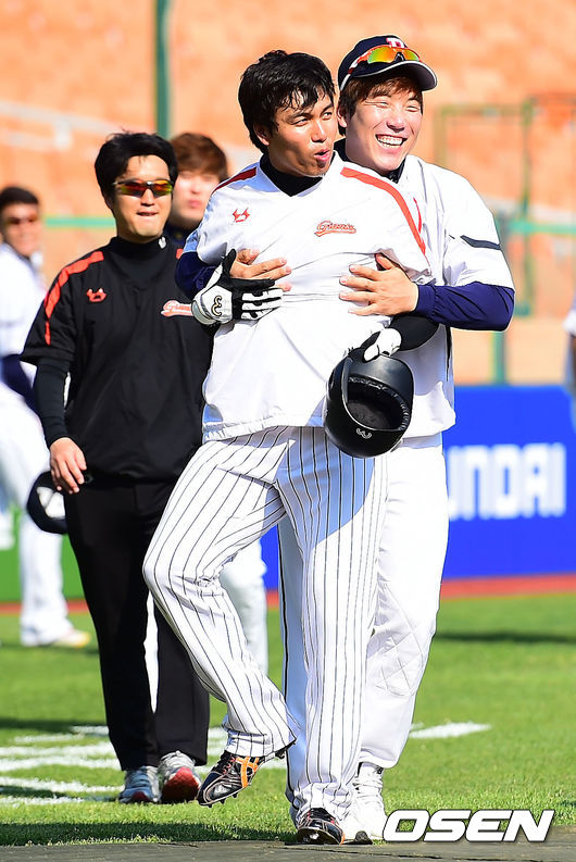 8일 오후 부산 사직구장에서 열린 '2014 한국야쿠르트 세븐 프로야구' 롯데 자이언츠와 두산 베어스의 경기에 앞서 두산 김현수가 롯데 김문호를 껴안으며 이야기를 나누고 있다.