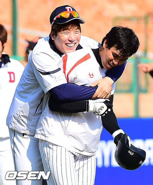 8일 오후 부산 사직구장에서 열린 '2014 한국야쿠르트 세븐 프로야구' 롯데 자이언츠와 두산 베어스의 경기에 앞서 두산 김현수가 롯데 김문호를 껴안으며 이야기를 나누고 있다.