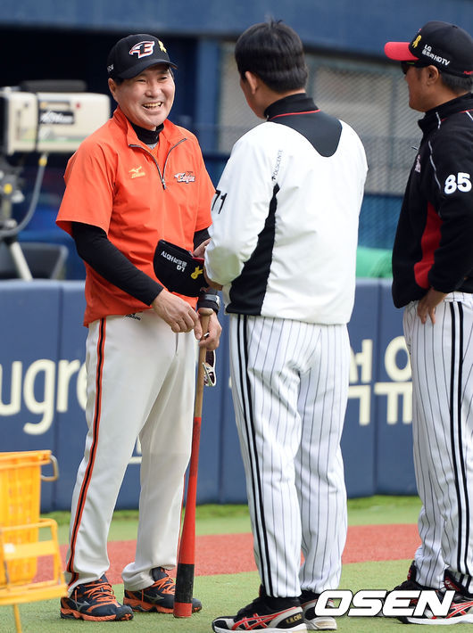 8일 오후 서울 잠실구장에서 열린 '2014 한국야쿠르트 세븐 프로야구' LG 트윈스와 한화 이글스의 경기전 한화 김종모 코치와 LG 조계현 감독 대행이 이야기를 나누고 있다.