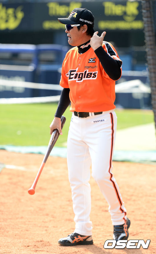 8일 오후 서울 잠실구장에서 열린 '2014 한국야쿠르트 세븐 프로야구' LG 트윈스와 한화 이글스의 경기전 한화 이종범 코치가 고동진의 배트로 타격연습 후 고통스러워하고 있다.
