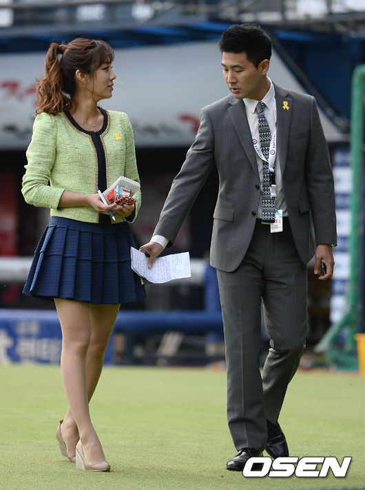 8일 오후 서울 잠실구장에서 열린 '2014 한국야쿠르트 세븐 프로야구' LG 트윈스와 한화 이글스의 경기전 정순주 XTM 정순주 아나운서와 김수환 캐스터가 인터뷰 후 그라운드를 빠져나가고 있다.