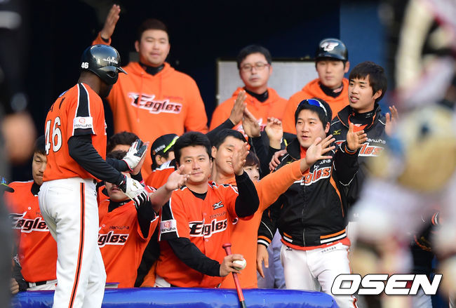 8일 오후 서울 잠실구장에서 열린 '2014 한국야쿠르트 세븐 프로야구' LG 트윈스와 한화 이글스의 경기, 1회초 2사 만루 한화 최진행의 선취 3타점 적시타때 1루 주자 피에가 홈을 밟은 뒤 동료들의 축하를 받고 있다.