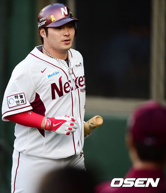 8일 오후 서울 목동구장에서 열린 ‘2014 한국야쿠르트 세븐 프로야구’ 넥센 히어로즈와 NC 다이노스의 경기, 1회말 2사 주자 없는 상황에서 넥센 이택근에 이어 박병호가 솔로 홈런을 날린 후 덕아웃으로 들어오고 있다.
