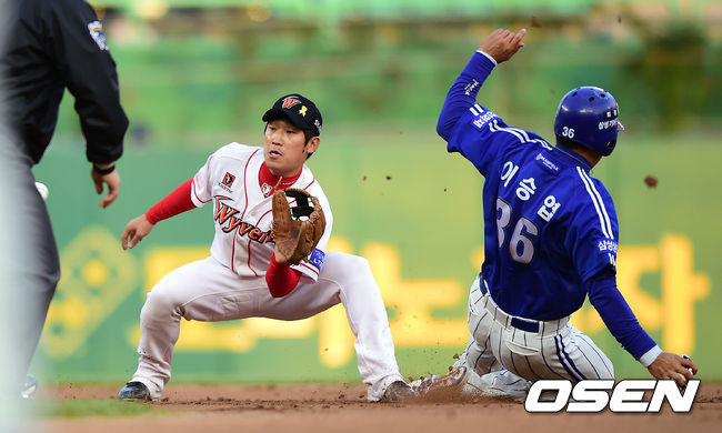 2회초 2사 1루 SK 신현철이 2루 도루를 시도하던 삼성 이승엽을 잡아내고 있다.