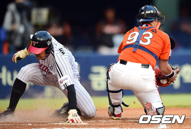 8일 오후 서울 잠실구장에서 열린 '2014 한국야쿠르트 세븐 프로야구' LG 트윈스와 한화 이글스의 경기, 1회말 1사 1,3루 LG 조쉬벨의 희생플라이때 3루 주자 백창수가 홈태그업 시도해 세이프되고 있다.
