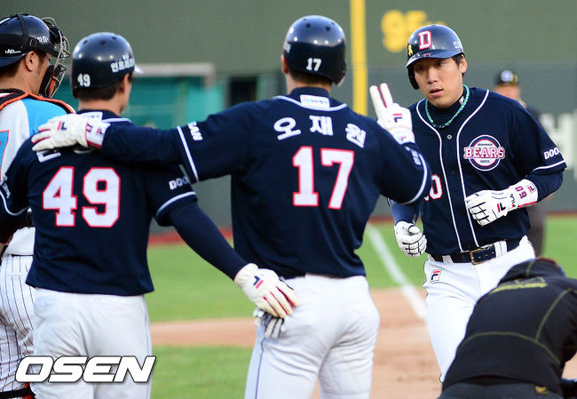 8일 오후 부산 사직구장에서 열린 '2014 한국야쿠르트 세븐 프로야구' 롯데 자이언츠와 두산 베어스의 경기, 1회초 무사 1,2루서 김현수의 우월 스리런으로 홈을 밟은 1루주자 민병헌과 2루주자 오재원이 홈으로 들어오는 김현수를 반기고 있다.