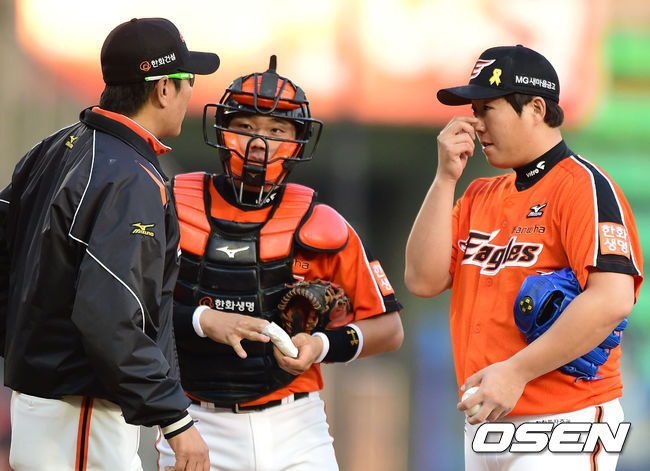 8일 오후 서울 잠실구장에서 열린 '2014 한국야쿠르트 세븐 프로야구' LG 트윈스와 한화 이글스의 경기, 1회말 볼넷과 안타로 무사 1,3루 위기에서 한화 정민철 투수코치가 마운드에 올라 송창현 선발투수와 이야기를 나누고 있다.