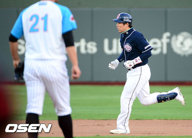 8일 오후 부산 사직구장에서 열린 '2014 한국야쿠르트 세븐 프로야구' 롯데 자이언츠와 두산 베어스의 경기, 1회초 무사 1,2루서 우월 스리런을 날린 두산 김현수가 그라운드를 돌고 있다.