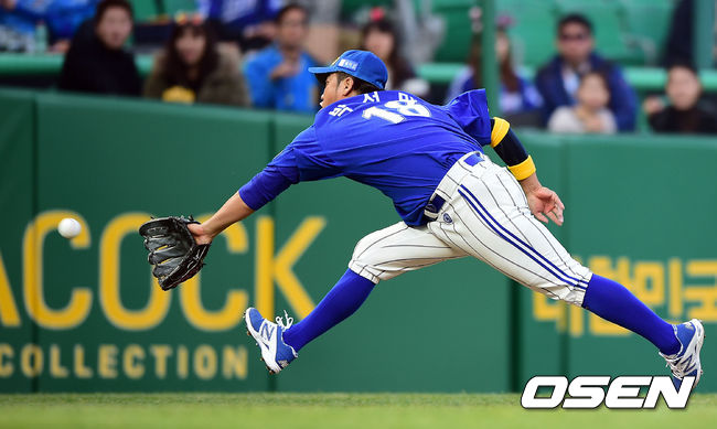 3회말 무사 1루 삼성 박석민이 SK 신현철의 번트 타구를 잡으려다 놓치고 있다.